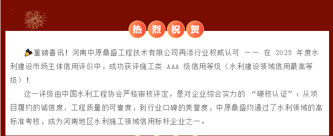 中原鼎盛荣获水利 AAA 企业信用等级证书